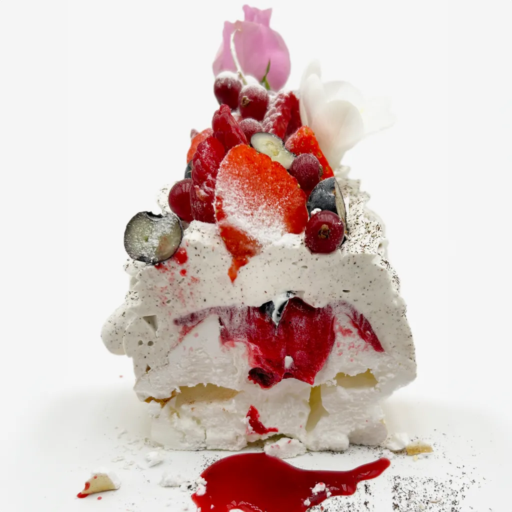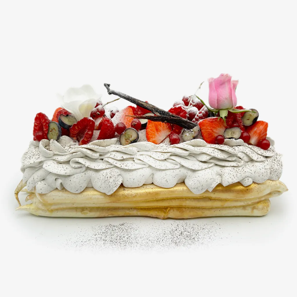 Meringue moelleuse floquée au chocolat blanc et poudre d’or, crème onctueuse à la vanille de Madagascar, compotée de cassis et framboise.